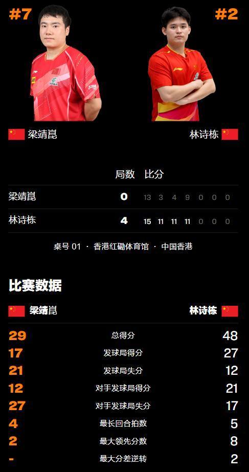 2025年WTT香港总决赛,国乒在男单赛场得回了四个参赛限额,但在分组抽签中命运欠安,二号种子林诗栋在第一轮就和队友梁靖崑狭路相逢,在首个比赛日和搭档蒯曼依然打了一场混双比赛的小石头,第二个比赛日迎来了男单首秀,将和大胖争夺一个八强的限额,本场比赛梁靖崑首局打得可以,但接下来全皆被小石头压制,眼睁睁看着林诗栋大比分4-0顺利晋级,梁靖崑也成为了国乒在本届总决赛第一位出局的男单选手。